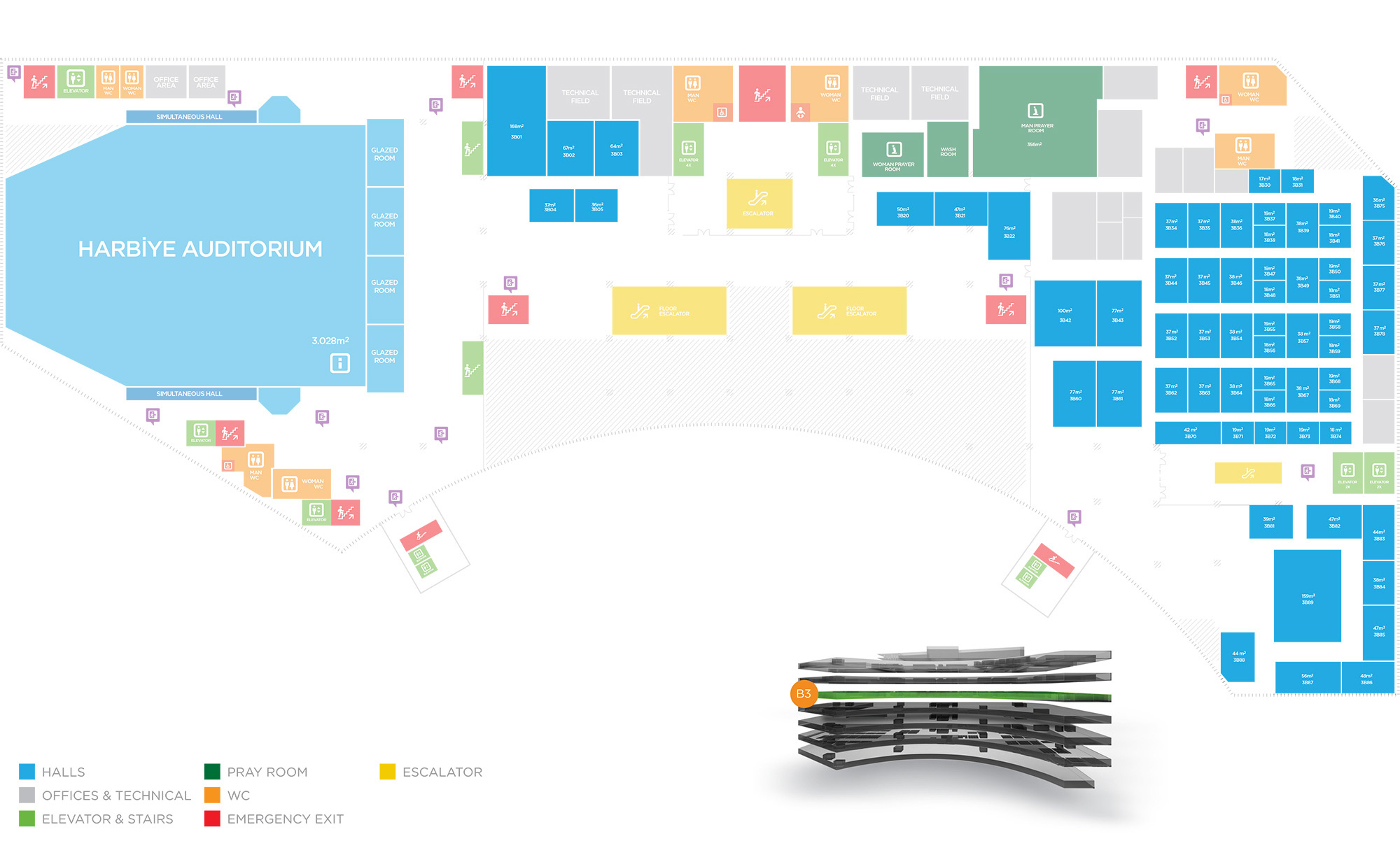 There are a total of 64 workshop rooms differing in sizes from 17 to 168m2 on the B3 floor of Istanbul Congress Center.